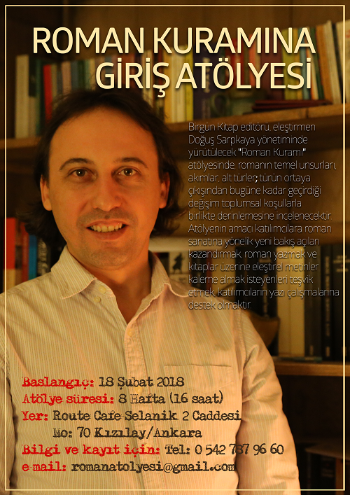 Birgün Kitap editörü, eleştirmen Doğuş Sarpkaya yönetiminde yürütülecek “Roman Kuramı” atölyesinde romanın temel unsurları, akımlar, alt türler; türün ortaya çıkışından bugüne kadar geçirdiği değişim toplumsal koşullarla birlikte derinlemesine incelenecektir.